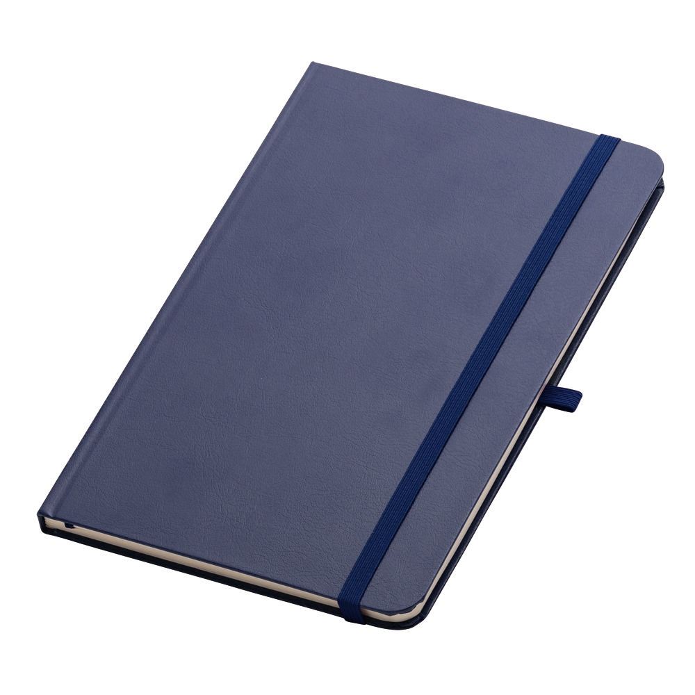 Caderneta de couro sintético com elástico suporte para caneta, fita elástica para fechar e fita "marca página" em nylon. Possui aproximadamente 80 folhas amarelas com pauta.