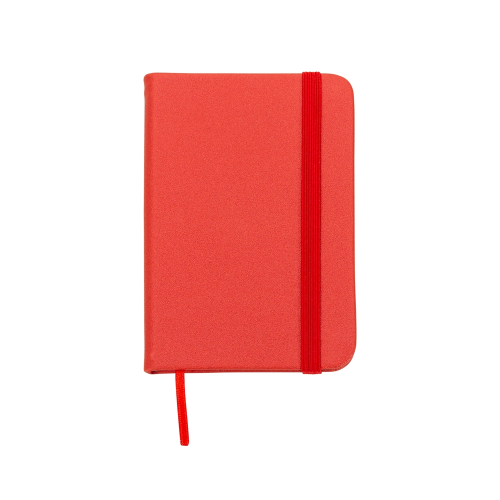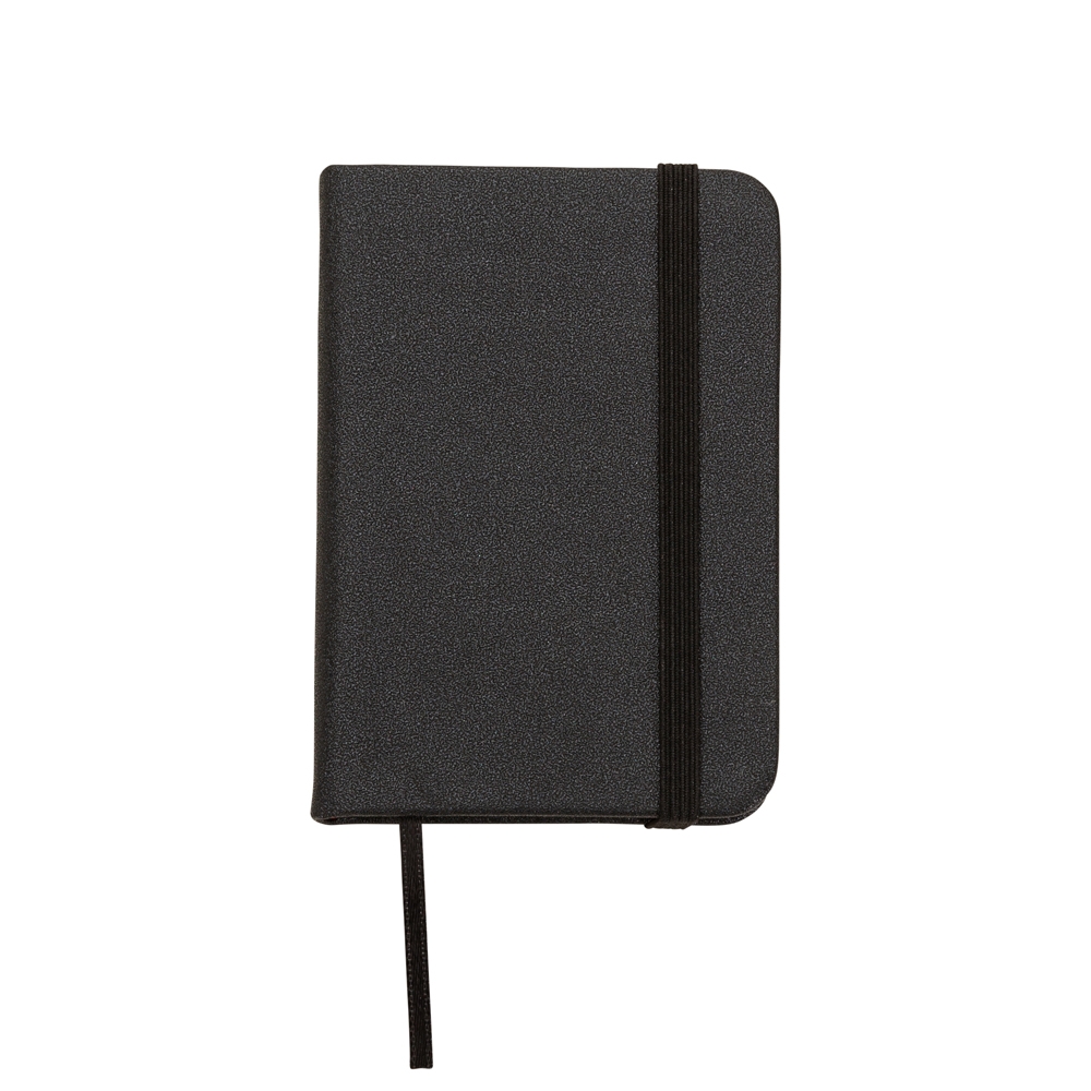 Mini Caderneta em material sintético brilhante com marcador de página em cetim e fita elástica para fechar. Contém aproximadamente 80 folhas amareladas sem pauta.