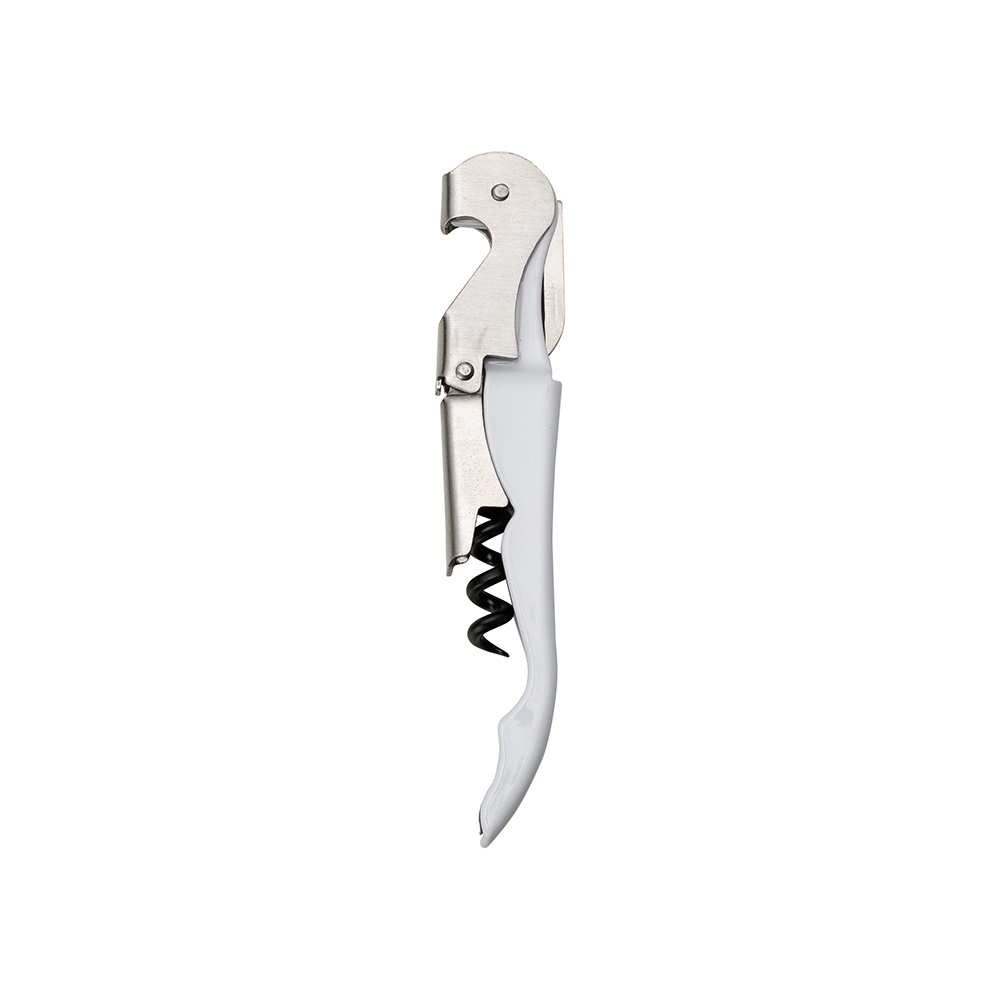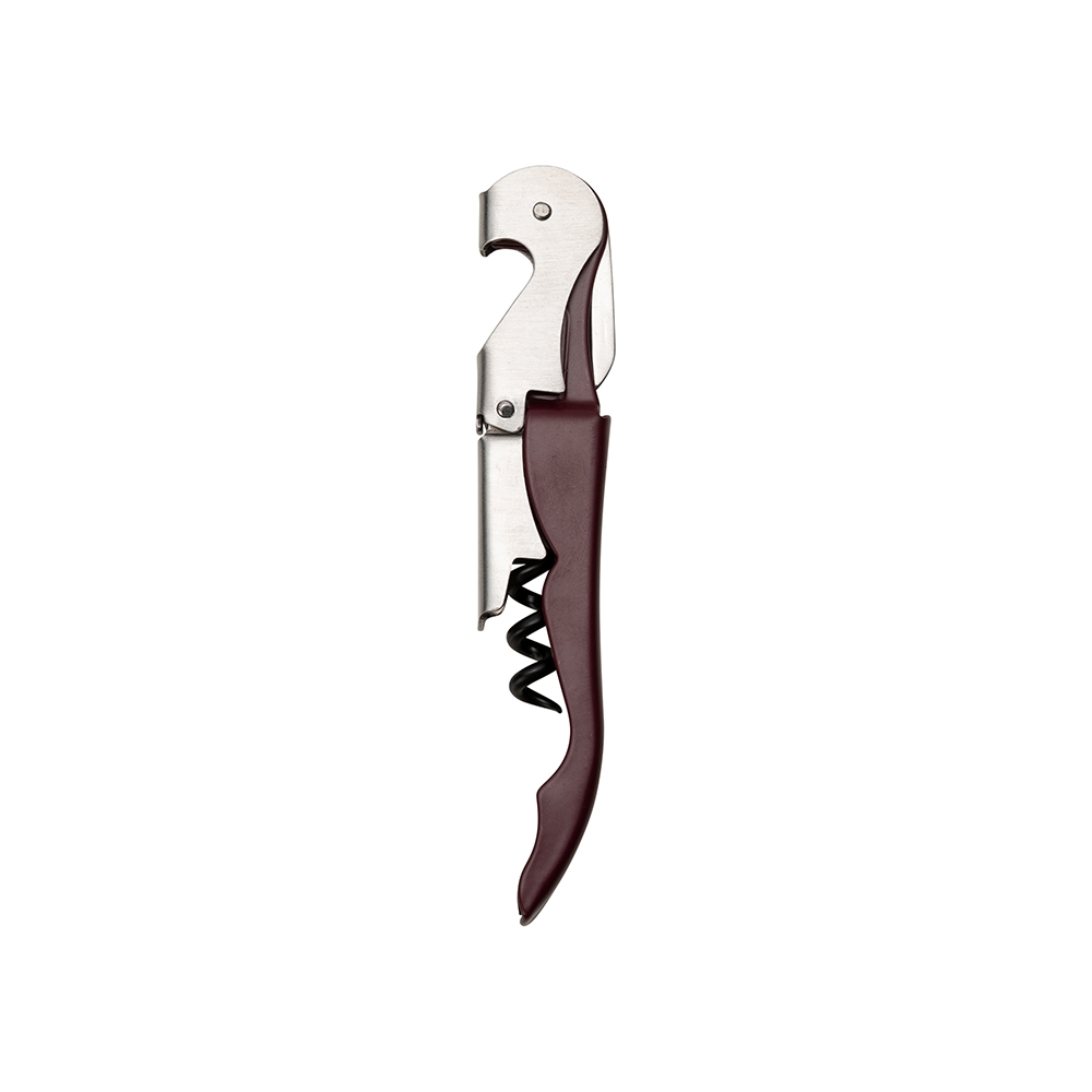 Saca rolhas metálico de 2 estágios com acabamento fosco. Contém abridor de garrafa, lâmina de corte e saca rolhas.
